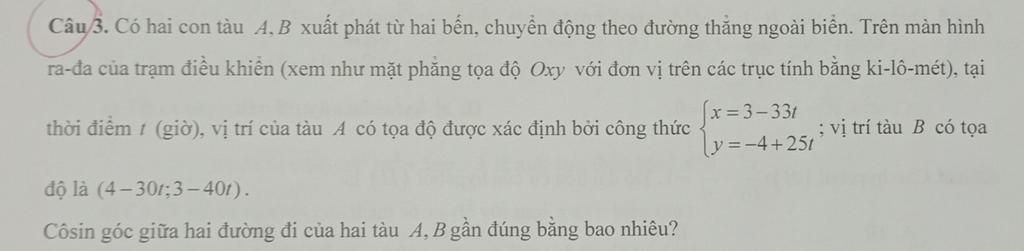 Câu 3. Có hai con tàu A, B xuất phát từ hai bến, chuyển động theo đường thẳng ngoài biển. Trên màn hình