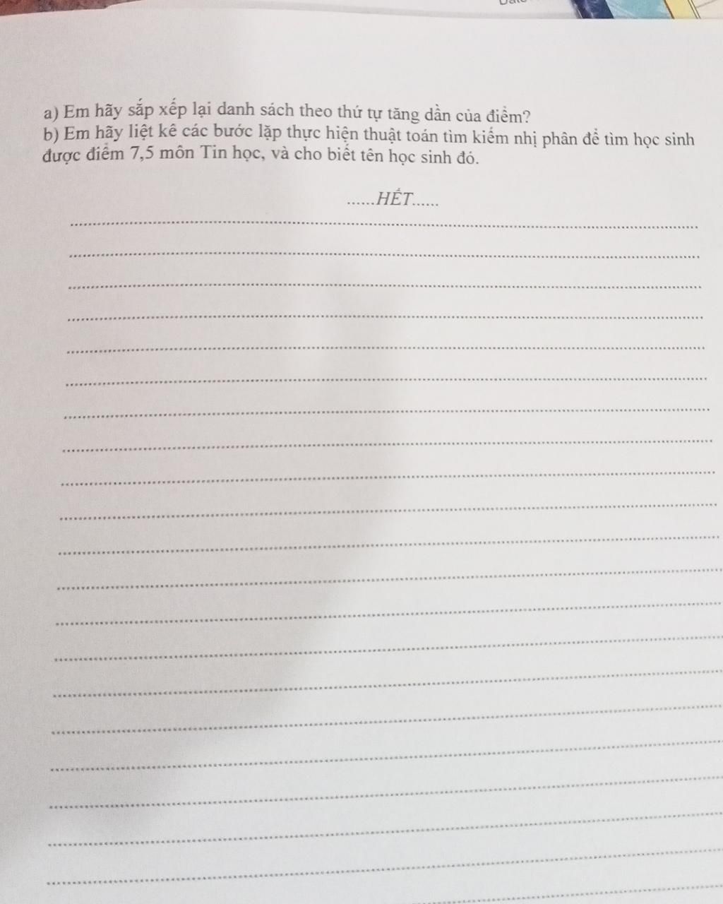 b. Em hãy liệt kê các bước lặp thực hiện thuật toán tìm kiếm nhị phân để tim học sinh được điểm 7,5 môn tin học,và cho biết tên học sinh đó