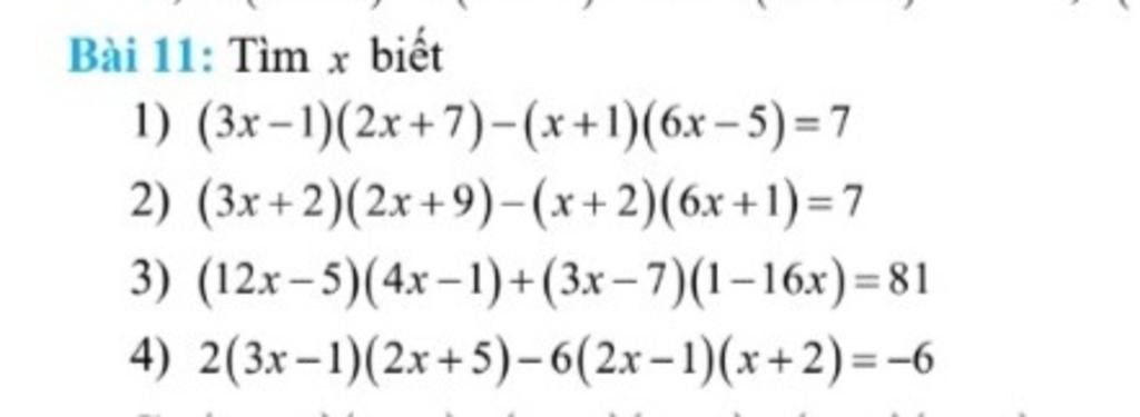 `b) (3x+2)(2x+9)-(x+2)(6x+1)=7`
