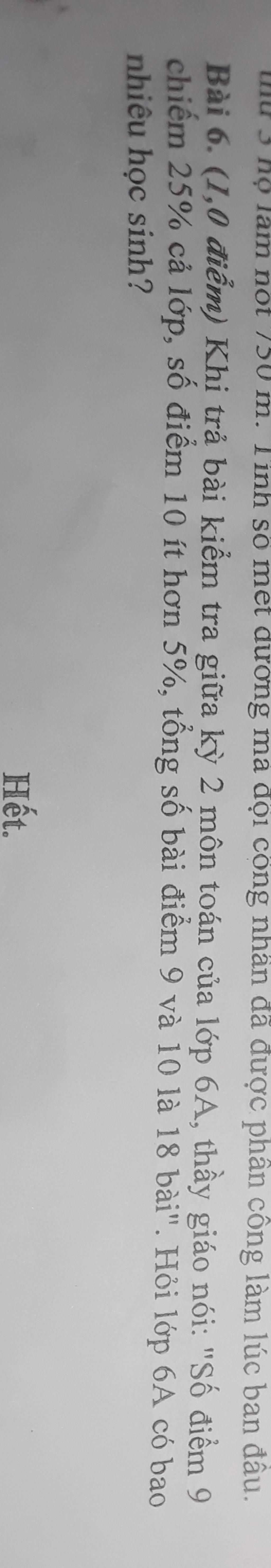 Bài 6. (1,0 điểm) Khi trả bài kiểm tra giữa kỳ 2 môn toán của lớp 6A, thầy giáo nói: "Số điểm 9 chiếm 25% cả lớp, số điểm 10 ít hơn 5%, tổng số bài điểm 9 và 10 là 18 bài". Hỏi lớp 6A có bao nhiêu học sinh?