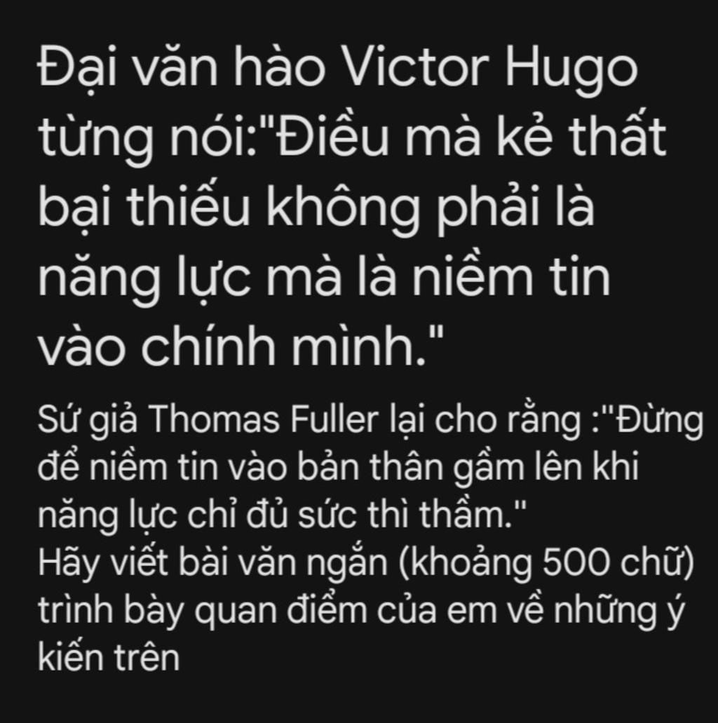 Vậy , cả hai quan điểm của Victor Hugo và Thomas Fuller đều có lý của nó. Niềm tin vào chính mình và năng lực đều là các yếu tố quan trọng để đạt được thành công. Chúng ta cần phải có cả niềm tin và năng lực để đạt được thành công và trở thành người thành đạt.