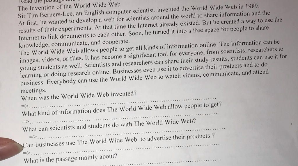 Dẫn chứng : Sir Tim Bernes-Lee , an English computer scientiset , invented the Wide Web invented in 1989 .