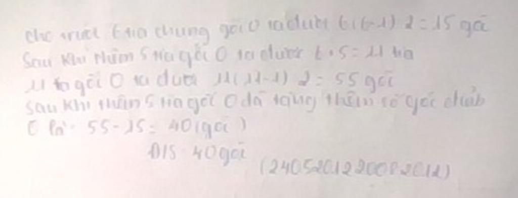 Số góc tăng thêm sau khi vẽ thêm `5` tia mới không trùng với các tia cho trước là :