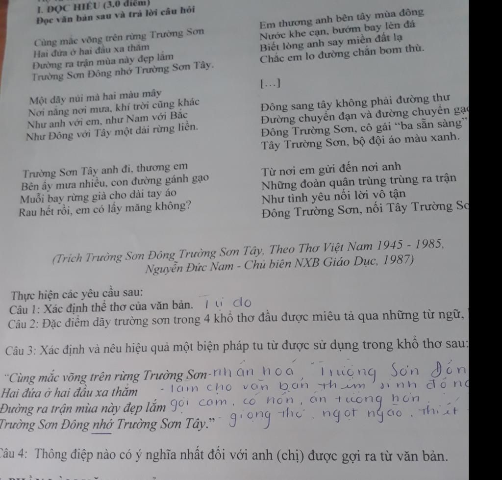 4. Thông điệp có ý nghĩa nhất với em đó là tinh thần yêu nước, truyền thống bất khuất trong kháng chiến chống Mỹ của thế hệ thanh thiếu niên. Đồng thời, em cũng cảm nhận được tinh thần lạc quan, tình yêu đôi lứa đẹp đẽ của những thế hệ trẻ trong kháng chiến chống Mỹ.