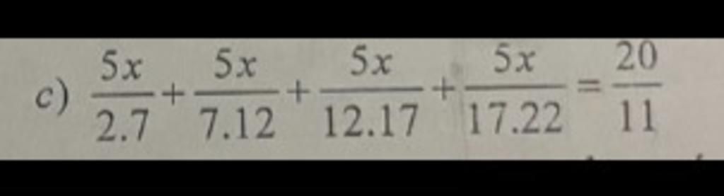 `c) (5x)/(2.7)+(5x)/(7.12)+(5x)/(12.17)+(5x)/(17.22)=20/11`