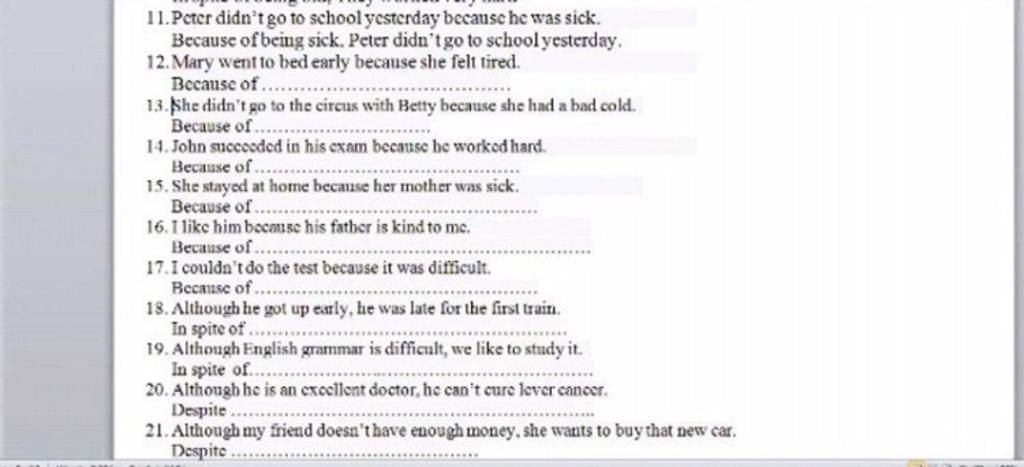 17. Because of the difficulty of the test, I couldn't do it. Because+ clause= Because+ N/Ving: bởi vì