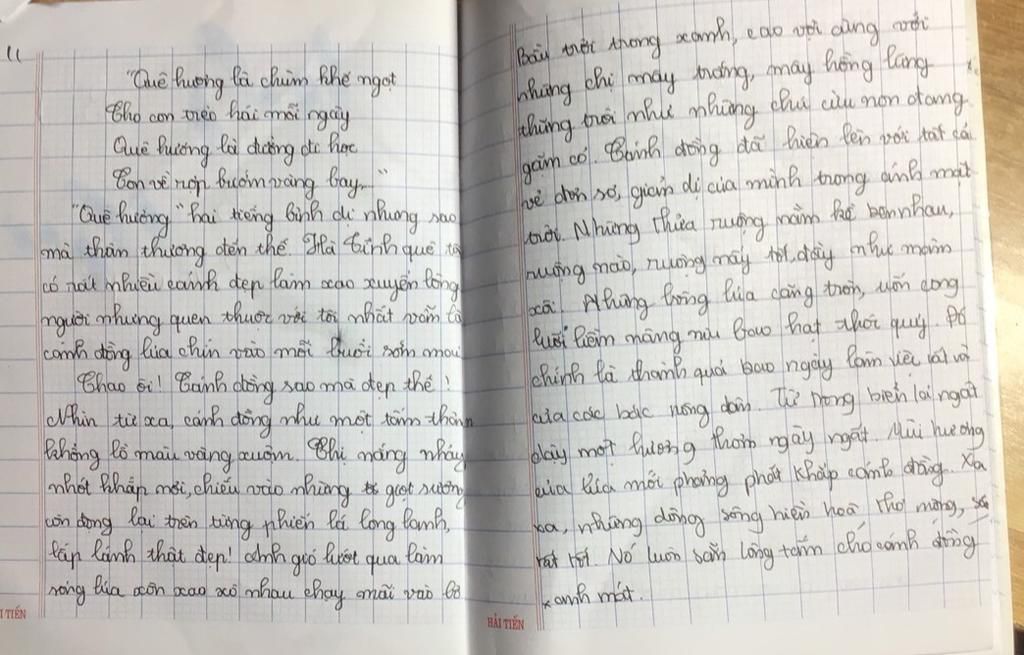 Nắng rọi qua ngọn cây, các chị thoăn thoắt gánh lúa về sân phơi. Dưới ruộng, từng gốc rạ trơ ra như mỉm cười với khoảng không gian khoáng đãng về sự đóng góp của mình. Vài chú chim từ trên cây vội sà xuống, ríu rít gọi nhau đi nhặt thóc rơi. Đôi chó nhà ai rượt đuổi nhau trên cánh đồng ruộng. Đàn cò đánh nhịp, điểm trắng trên mảng trời xanh.