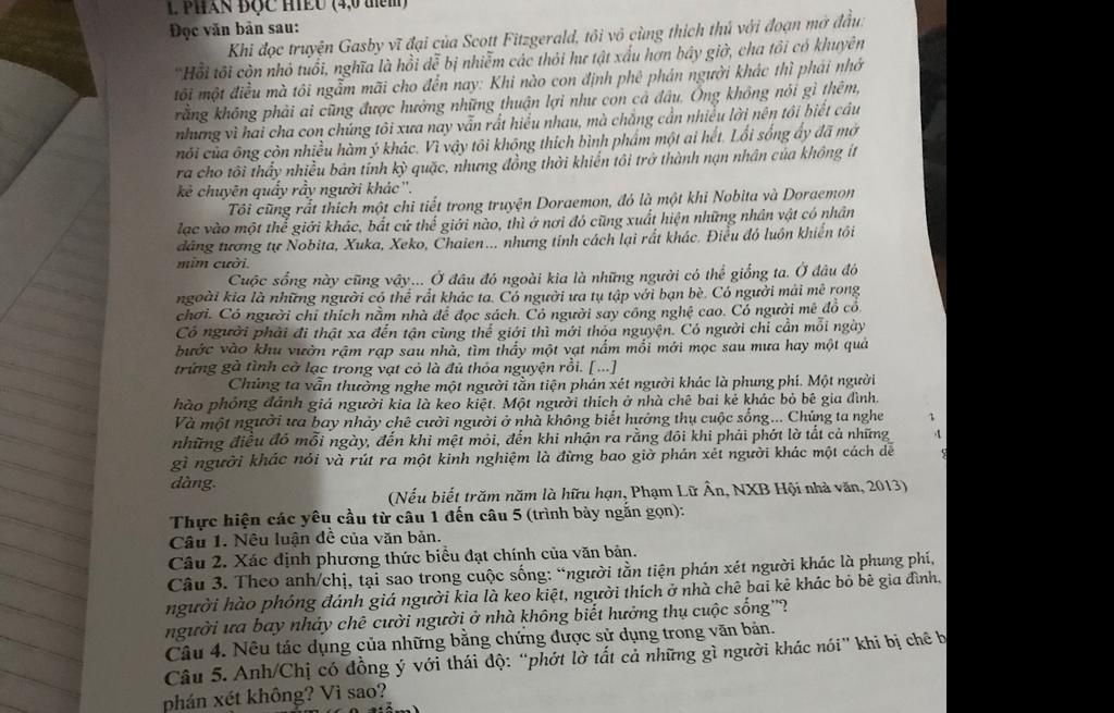 Khi đọc truyện Gasby vĩ đại của Scott Fitzgerald, tôi vô cùng thích thú với đoạn mở đầu: “Hồi tôi còn nhỏ tuổi, nghĩa là hồi dễ bị nhiễm các thói hư tật xấu hơn bây giờ, cha tôi có khuyên tôi một điều mà tôi ngẫm mãi cho đến nay: Khi nào con định phê phán người khác thì phải nhớ rằng không phải ai cũng được hưởng những thuận lợi như con cả đâu. Ông không nói gì thêm, nhưng vì hai cha con chúng tôi xưa nay vẫn rất hiểu nhau, mà chẳng cần nhiều lời nên tôi biết câu nói của ông còn nhiều hàm ý khác. Vì vậy tôi không thích bình phẩm một ai hết. Lối sống ấy đã mở ra cho tôi thấy nhiều bản tỉnh kỳ quặc, nhưng đồng thời khiến tôi trở thành nạn nhân của không ít kẻ chuyên quấy rầy người khác".