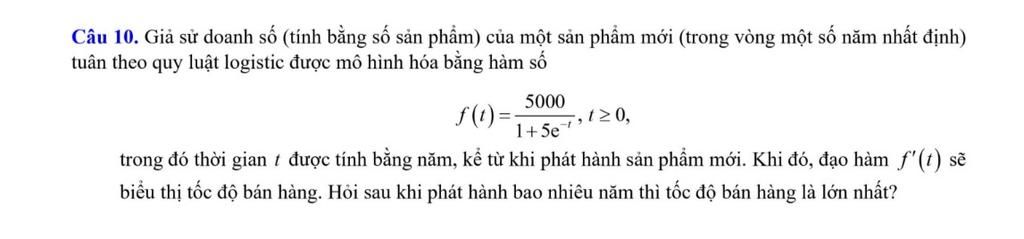 Câu 10. Giả sử doanh số (tính bằng số sản phẩm) của một sản phẩm mới (trong vòng một số năm nhất định)