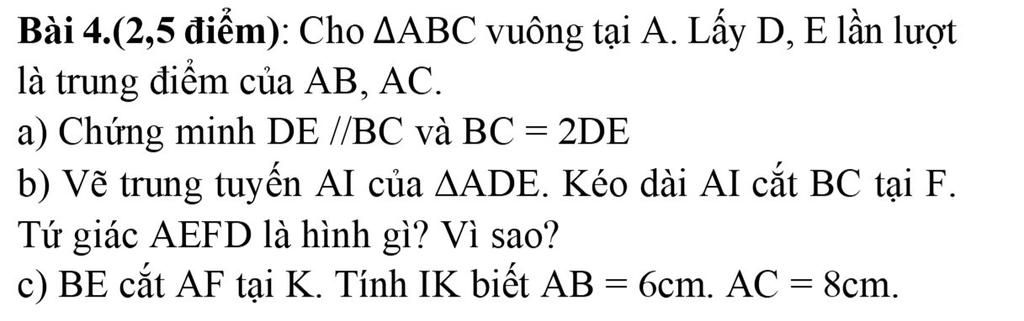 a) Ta có: D,E lần lượt là trung điểm của AB, AC