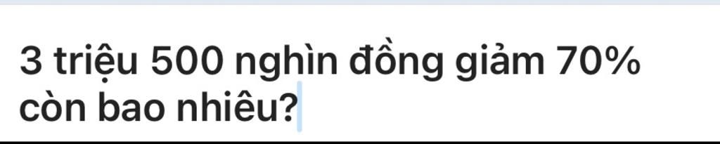Đổi `3` triệu `500` nghìn đồng `=3,5` triệu.\(\\\) `3` triệu `500` nghìn đồng giảm `70%` còn:\(\\\)`3,5 . (100%-70%)=1,05` (triệu đồng) `=1` triệu `50` nghìn đồng \(\\\) Công thức tính số tiền `x` khi giảm `a%`: \(\\\)`x . (100%-a%)`Hãy giúp mọi người biết câu trả lời này thế nào?