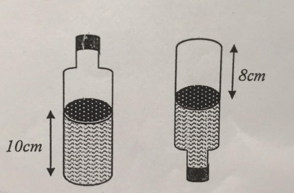 Một cái chai có chứa một lượng nước, phần chứa nước là hình trụ có chiều cao 10cm, khi lật ngược chai lại thì phần không chứa nước cũng là một hình trụ có chiều cao 8cm (như hình vẽ). Biết thể tích của chai là 450πcm³ . Tính bán kính của đáy chai (giả sử độ dày của thành chai và đáy chai không đáng kể) .
