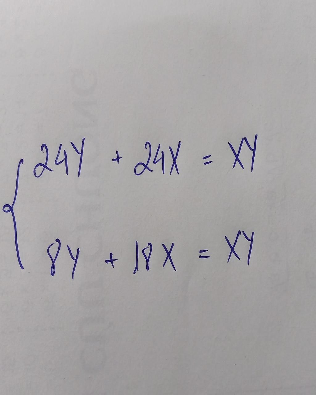 `{(24y + 24x = xy ( 1 )),(8y + 18x = xy ( 2 )):}`