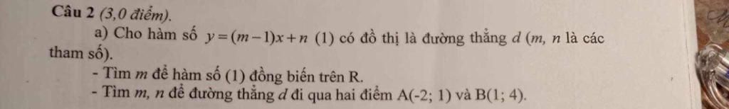a) Cho hàm số y=(m−1)x+n (1) có đồ thị là đường thẳng d (m, n là các