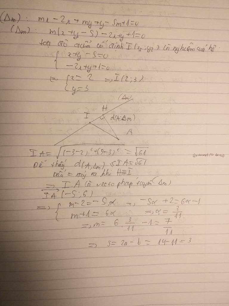 Cho đường thẳng `(Delta)_m: (m-2)x + (m+1)y-5m+1=0` với `m` là tham số, và điểm `A(-3;9)`. Giả sử `m = a/b` (Phân số tối giản) để khoảng cách từ `A` đến đường thẳng `(Delta)_m` là lớn nhất. Tính `S = 2a-b`