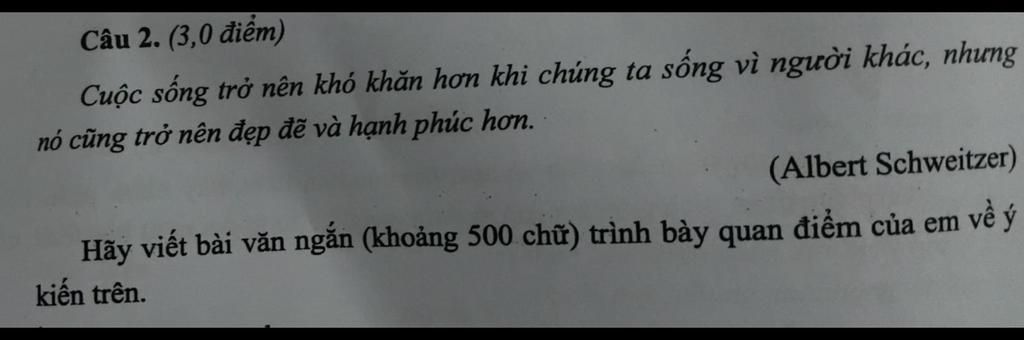 Cuộc sống muôn màu, muôn vẻ, muôn cách nhìn từ phía chúng ta và mọi người. Trong số chúng ta sẽ có những câu hỏi miên man về chính cuộc đời mình. Rằng " cách sống của hiện tại là đang sống vì điều gì, vì ai và mục đích sống là gì?". Ý kiến " Cuộc sống trở nên khó khăn hơn khi chúng ta sống vì người khác, nhưng nó cũng trở nên đẹp đẽ và hạnh phúc hơn của Albert Schweizer sẽ làm sáng tỏ định kiến ấy.