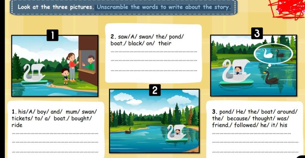 `1.` A boy and his mum bought tickets to ride a swan boat