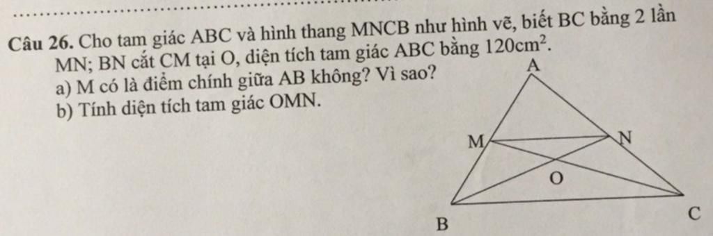 Mà hai tam giác này chung đáy BN nên chiều cao hạ từ M bằng 1/2 chiều cao hạ từ C.