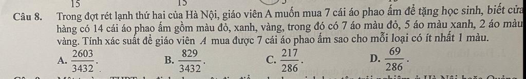 `A`: "Mua được `7` cái áo phao ấm sao cho mỗi loại có ít nhất `1` màu"