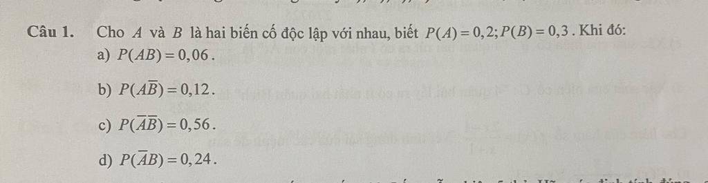 $\Rightarrow P(\overline{A}B) = P(\overline{A})P(B) = (1 - 0,2) . 0,3 = 0,24$