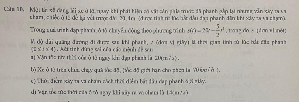 Vận tốc tức thời của ô tô ngay khi đạp phanh là: