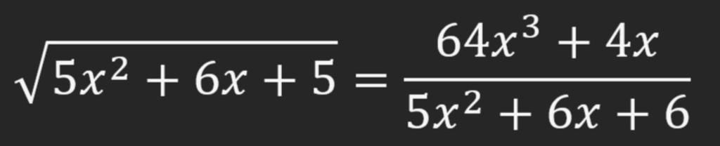 `\sqrt{5x^2 + 6x + 5} = ( 64x^3 + 4x )/( 5x^2 + 6x + 6 )`
