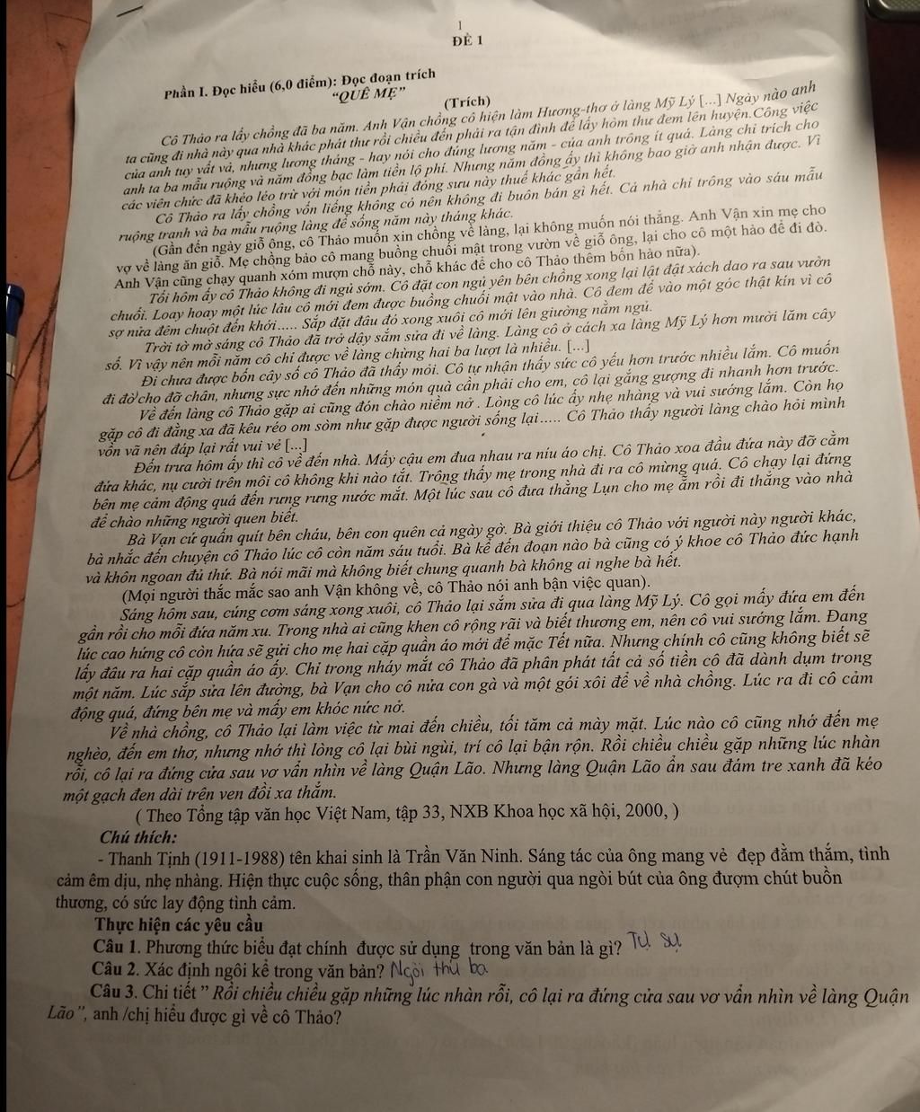 `3`) `°` Thể hiện rằng cô Thảo, người con gái lấy chồng xa nhưng vẫn luôn quyến luyến nhớ thương về nhà mẹ đẻ, ở nhà chồng, cô cũng vất vả trước cảnh làm dâu, làm vợ. Nhưng khi về nhà mẹ đẻ, cô là con gái cha mẹ, được thể hiện với người mình yêu thương với gia đình, thể hiện với mọi người rằng cuộc sống cô rất tốt. Từ đó cho thấy chi tiết thể hiện được cô có tình yêu thương với mẹ, với quê nhà, với gia đình.
