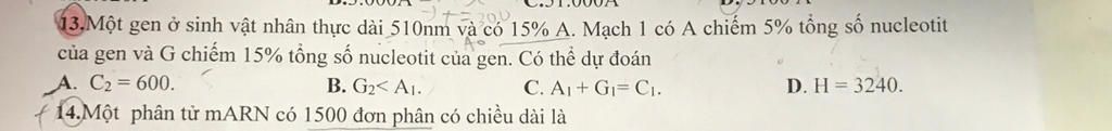 Nếu mạch 1 có Adenin chiếm 30% tổng số nucleoti của MẠCH thì A1=%A1 x(N/2). Còn nếu mạch 1 có Adenin chiếm 30% tổng số nucleotide của GENE thì A1=%A1 xN đk ạ