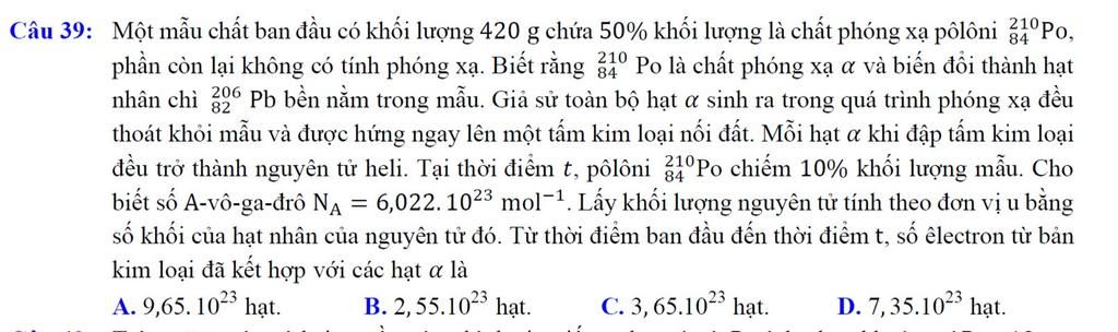 `=>` Số hạt `\alpha:` `N_{\alpha}=(105)/(131).6,022.10^{23}≈4,8268.10^{23}` (hạt)
