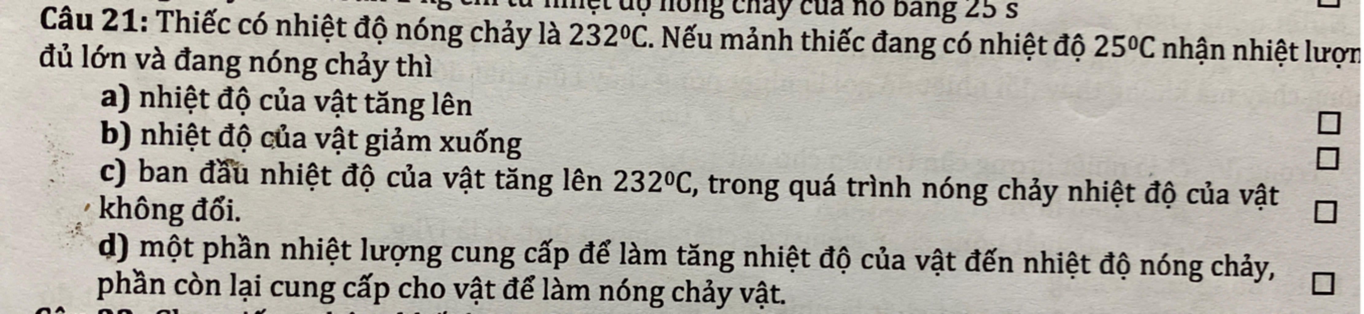 c) Nhiệt độ của vật tăng đến nhiệt độ nóng chảy, trong quá trình nóng chảy thì nhiệt độ của vật không đổi.