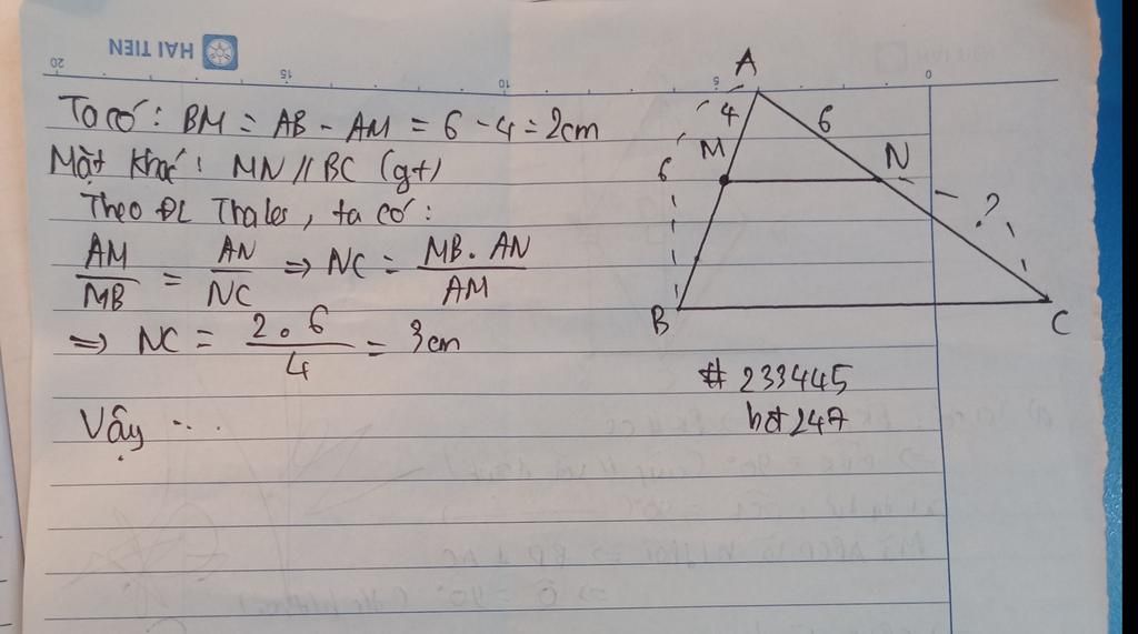 `(AM)/(BM)=(AN)/(CN)` `->NC=(BM * AN)/(AM)=(2*6)/4=3(cm)`
