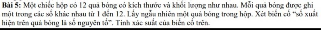`=>` Xác suất của biến cố "số xuất hiện trên quả bóng là số nguyên tố" là: `5/12`
