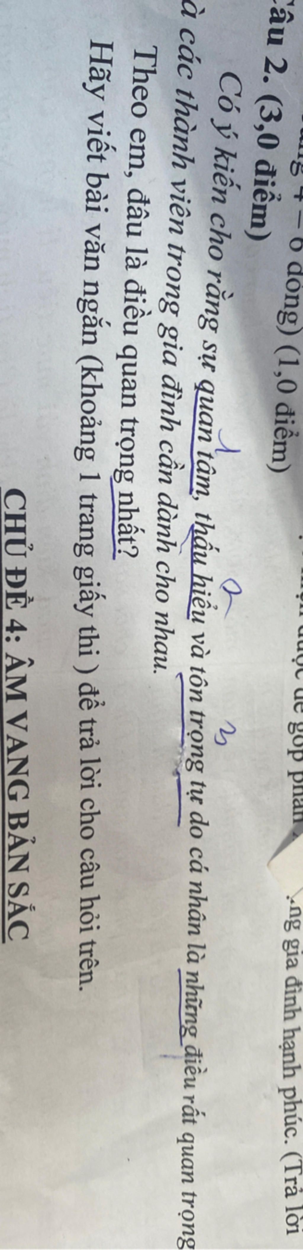 Gia đình là tổ ấm, là nơi mỗi chúng ta tìm về sau những bộn bề của cuộc sống. Chính trong không gian thiêng liêng này, những thành viên cần dành cho nhau sự quan tâm, thấu hiểu và tôn trọng để tạo dựng một môi trường sống hạnh phúc và bền vững. Vậy điều nào là quan trọng nhất? Theo em, cả ba yếu tố đều cần thiết và không thể tách rời, nhưng trong đó, sự quan tâm thấu hiểu đóng vai trò cốt lõi.Sự quan tâm thấu hiểu là biểu hiện của tình thương và trách nhiệm trong gia đình. Khi mỗi thành viên biết lắng nghe và cảm nhận những gì người khác đang trải qua, họ sẽ hiểu rõ hơn về tâm tư, nguyện vọng và những khó khăn mà người thân mình đang đối mặt. Điều này không chỉ giúp giải quyết những mâu thuẫn, xung đột mà còn tạo ra sự gắn kết, đồng cảm sâu sắc.Chẳng hạn, khi cha mẹ quan tâm thấu hiểu những áp lực học tập của con cái, họ sẽ biết cách động viên, hỗ trợ kịp thời thay vì chỉ trách móc, áp đặt. Ngược lại, khi con cái thấu hiểu những lo toan, vất vả của cha mẹ, chúng sẽ biết trân trọng công sức và tình thương của đấng sinh thành. Chính sự thấu hiểu này là cầu nối gắn kết tình cảm gia đình, giúp mọi người cảm thấy được yêu thương và chia sẻ.Bên cạnh sự quan tâm thấu hiểu, tôn trọng lẫn nhau cũng là yếu tố quan trọng không thể thiếu. Sự tôn trọng là cơ sở của mối quan hệ bình đẳng và lành mạnh giữa các thành viên trong gia đình. Khi cha mẹ tôn trọng ý kiến, sở thích của con cái, chúng sẽ cảm thấy được coi trọng và tự tin hơn trong cuộc sống. Ngược lại, con cái tôn trọng cha mẹ sẽ thể hiện qua việc lắng nghe, vâng lời và biết ơn những gì cha mẹ đã làm cho mình.Sự tôn trọng còn giúp duy trì sự hòa hợp và tránh những xung đột không đáng có. Khi mọi người tôn trọng lẫn nhau, họ sẽ biết cách kiềm chế, lắng nghe và thảo luận một cách xây dựng thay vì áp đặt hoặc chỉ trích lẫn nhau. Điều này giúp tạo ra một môi trường gia đình an lành, hạnh phúc và bền vững.Dù sự quan tâm thấu hiểu có vai trò cốt lõi, nhưng để gia đình thực sự hạnh phúc, không thể thiếu đi sự tôn trọng và tình thương. Tất cả ba yếu tố này phải hòa quyện và bổ trợ lẫn nhau. Sự quan tâm thấu hiểu giúp tạo ra nền tảng cho tình thương yêu và sự tôn trọng. Ngược lại, khi có tình thương yêu và sự tôn trọng, mọi người sẽ dễ dàng hơn trong việc thấu hiểu và quan tâm lẫn nhau.Trong một gia đình, sự quan tâm thấu hiểu, tình thương yêu và sự tôn trọng là những yếu tố không thể thiếu để tạo nên một tổ ấm hạnh phúc. Dù mỗi yếu tố có vai trò và ý nghĩa riêng, nhưng sự quan tâm thấu hiểu vẫn là cốt lõi, là nền tảng giúp gia đình gắn kết và yêu thương lẫn nhau. Chỉ khi mọi người biết lắng nghe, chia sẻ và tôn trọng lẫn nhau, gia đình mới thực sự trở thành nơi mọi người cảm thấy bình yên và hạnh phúc khi trở về.