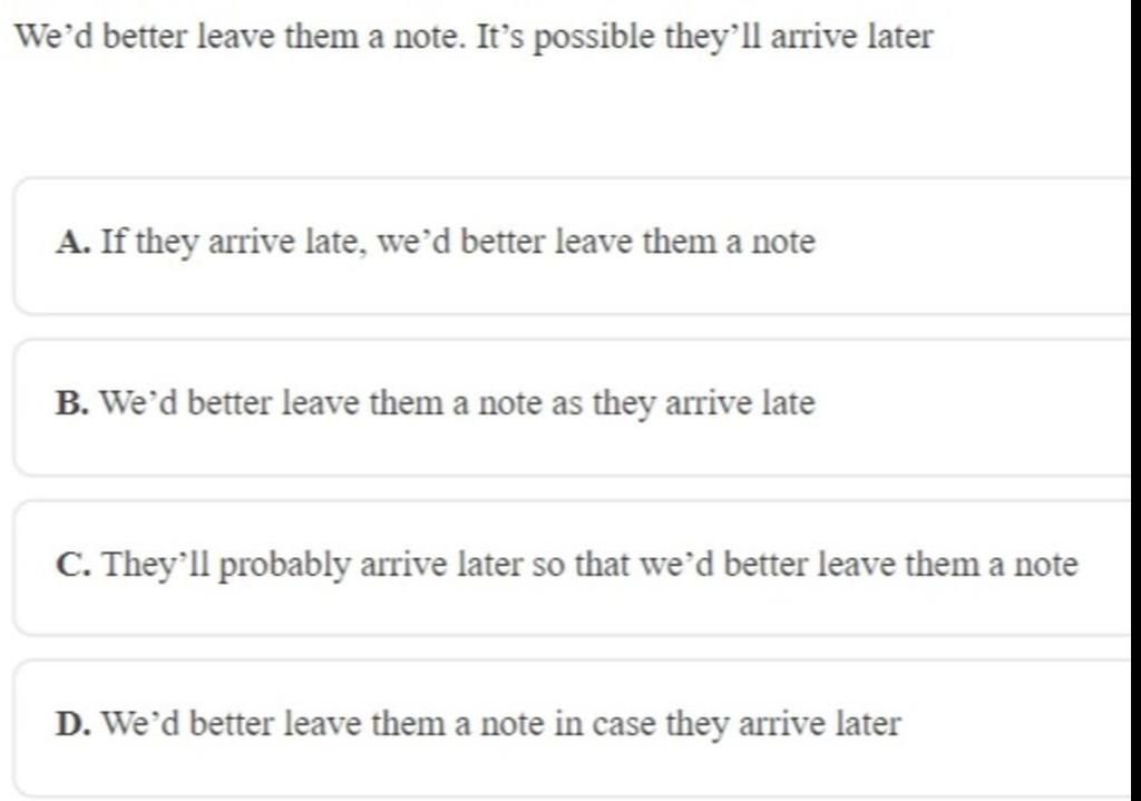 `=` Had better do sth + in case + S + V: nên làm gì trong trường hợp ai làm gì.