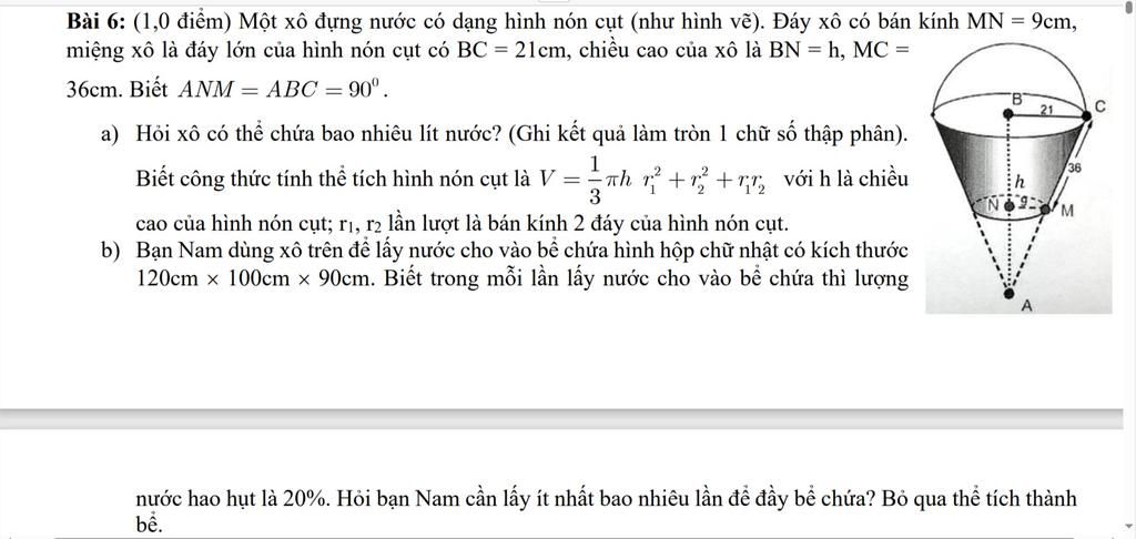 b) Thể tích hình chữ nhật 120x100x90=1080000 $cm^{3}$
