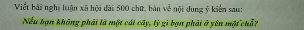 `@` Mở bài `2:` Có ý kiến rằng: ''Nếu bạn không phải là một cái cây, lí gì bạn phải ở yên một chỗ?'', nó đã khiến tôi đặt ra cho bản thân nhiều thắc mắc, câu hỏi. Tôi hiểu rằng chúng ta không phải một cái cây đứng im bất động, chẳng phải một cái cây không thể nhúc nhích, chẳng thể di chuyển nhưng dường như chúng ta lại sống hệt như một cái cây. Chúng ta có đôi chân và sao chúng ta không bước ra khỏi vùng an toàn của bản thân, mà ta không trải nghiệm, khám phá và cảm nhận vẻ đẹp cuộc sống muôn màu xung quanh ta nhỉ?