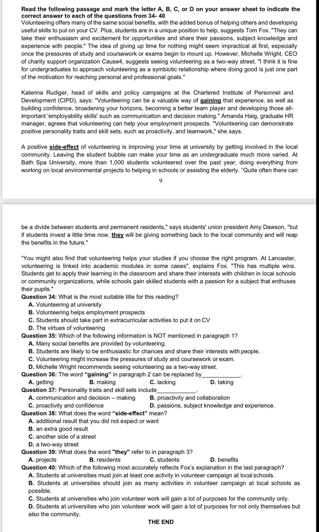 `34,` D. The virtues of volunteering (Những lợi ích của tình nguyện)
