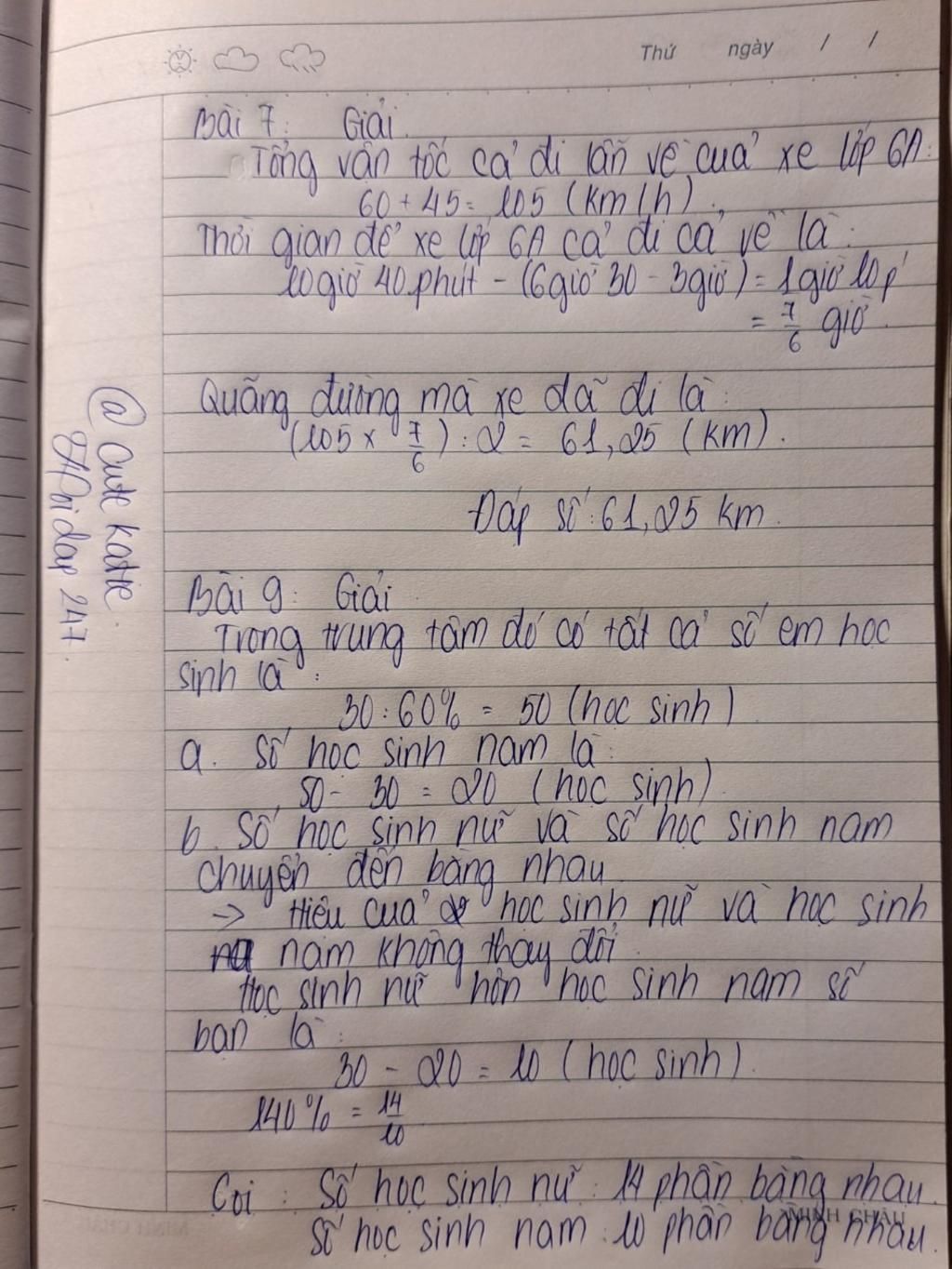 Câu 7: lớp 6A được tổ chức đi dã ngoại lúc 6h30p. Biết vận tốc của xe đi dã ngoại là 60km/h. Lớp ở khu du lịch chơi 3 tiếng. Lúc về xe đi với vận tốc 45km/h thì đến trường lúc 10h40p cùng ngày. Tính quãng đường xe đã đi?