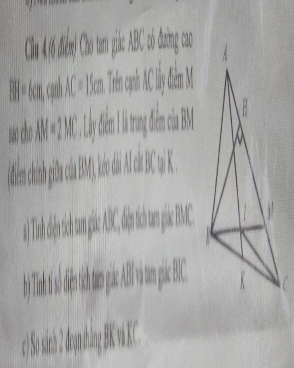 Cho tam giác ABCD có đường cao BH = 6 cm, cạnh AC = 15 cm. Trên cạnh ac lấy điểm M sao cho AM = 2 MC. Lấy điểm y là trung điểm của BM (điểm chính giữa củaBM) kéo dài ai cắt BC tại k.