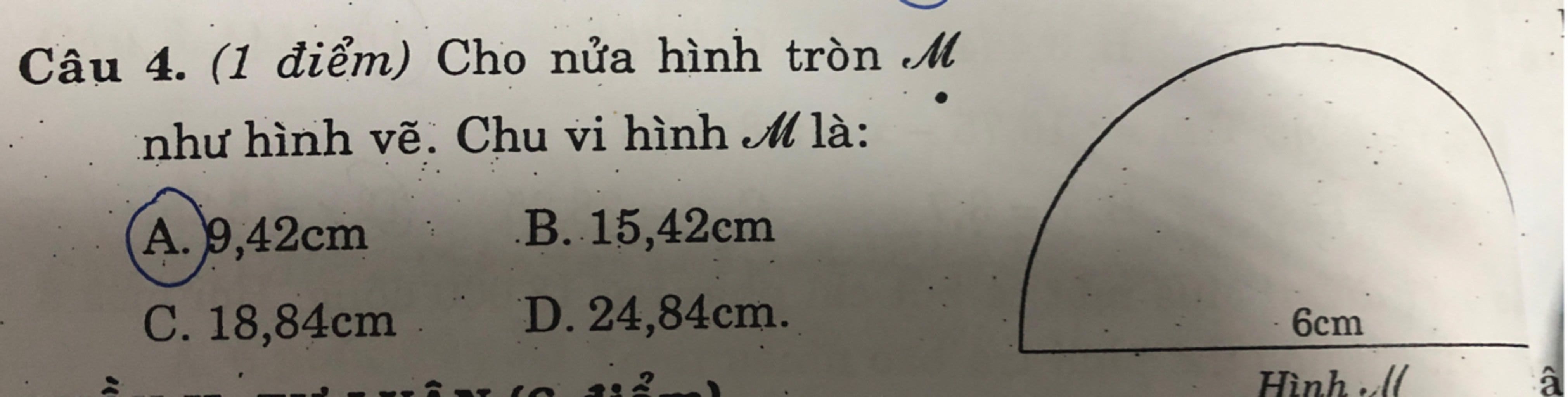 Vậy chu vi hình $\textit{M}$ là $\text{9,42 cm+6=15,42 cm}$