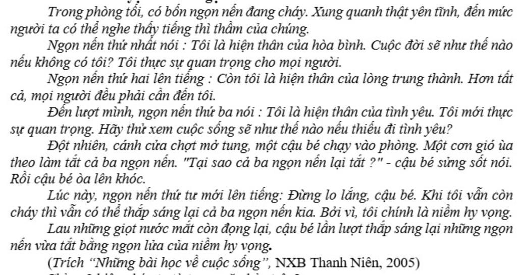 1. Anh/chị hiểu thế nào về lời thầm thì của ngọn nến thứ nhất: Tôi là hiện thân của hòa bình. Cuộc đời sẽ như thế nào nếu không có tôi ? Tôi thực sự quan trọng cho mọi người?