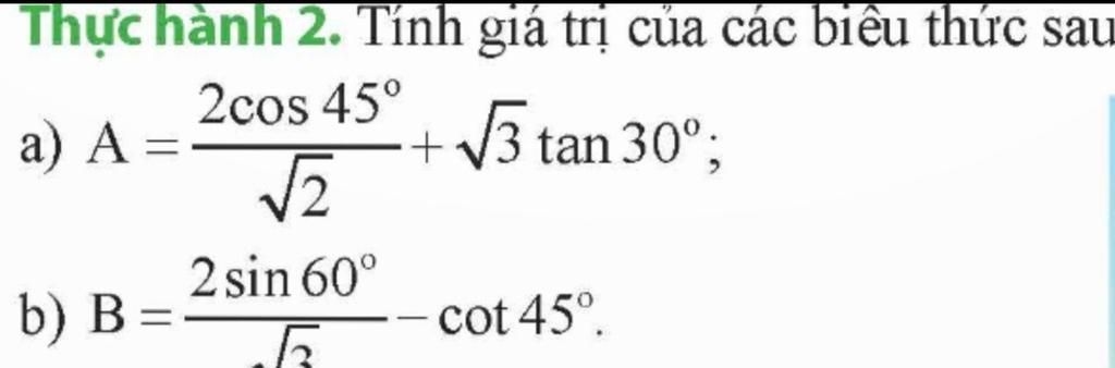 Ta có: $\bullet$ `cos45^{o}=\frac{1}{\sqrt{2}}=\frac{\sqrt{2}}{2}`