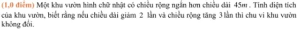 Do chiều dài giảm `2` lần và chiều rộng tăng gấp `3` lần thì chu vi không đổi nên ta có pt: