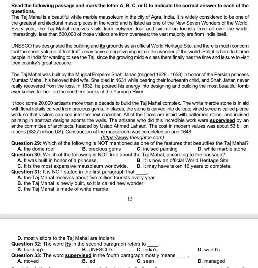- A (câu 1 đoạn 3) : The Taj Mahal was built by the Mughal Emperor Shah Jahan (reigned 1628-1658) in honor of the Persian princess Mumtaz Mahal, his beloved third wife.