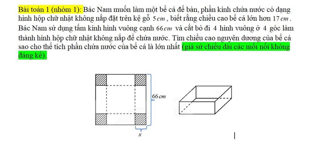Bài toán 1 (nhóm 1): Bác Nam muốn làm một bể cá để bàn, phần kính chứa nước có dạng