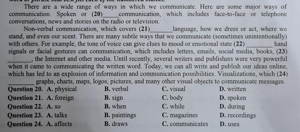 `-` Verbal Communication: Một cách giao tiếp thông qua ngôn từ (ngôn ngữ) hoặc âm thanh là giao tiếp bằng lời nói.