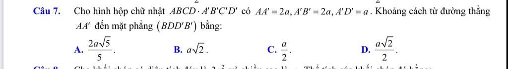 `=>A'I=(A'B'.A'D')/(\sqrt{A'B'²+A'D'²})=(2a.a)/(\sqrt{(2a)^2+a²})=(2a\sqrt{5})/5`