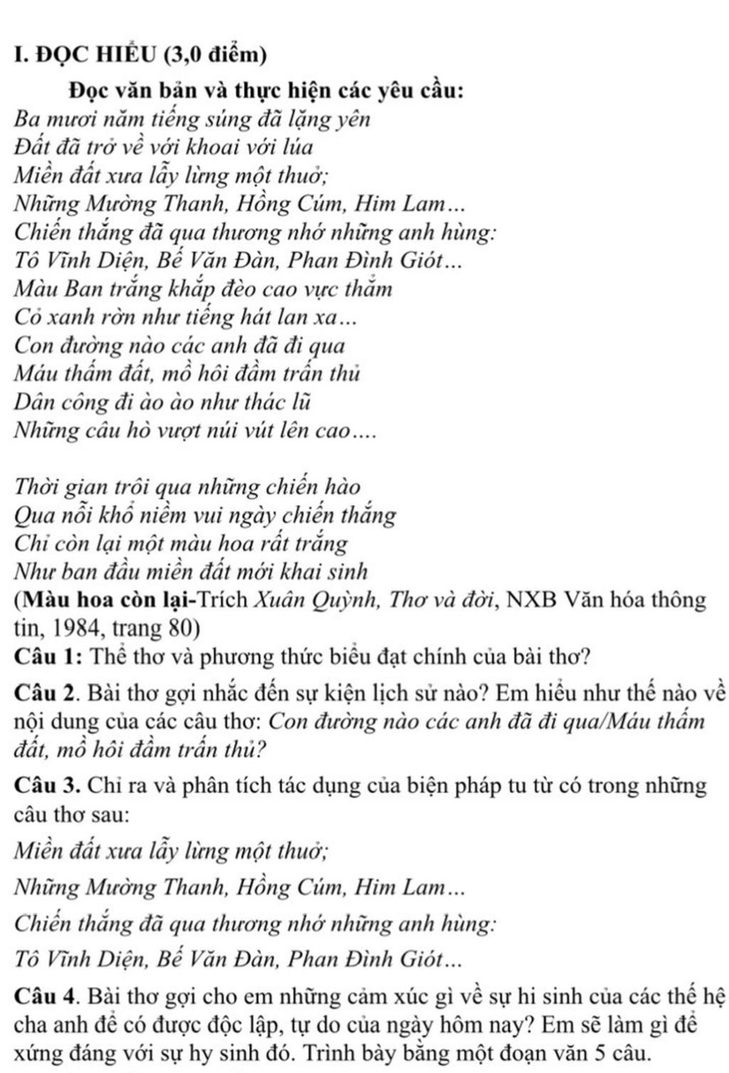 Bài thơ "Màu hoa còn lại" của Xuân Quỳnh đã gợi cho em nhiều cảm xúc sâu sắc về sự hy sinh cao cả của những người lính và dân công trong quá khứ. Họ đã không ngần ngại hiến dâng tuổi trẻ và máu xương của mình để giành lấy độc lập, tự do cho đất nước. Những hình ảnh về miền đất chiến thắng, nay bình yên với khoai lúa và màu hoa ban trắng, là minh chứng cho sự hy sinh thầm lặng mà vô cùng vĩ đại ấy. Để xứng đáng với những hy sinh của thế hệ cha anh, em sẽ sống có trách nhiệm và cống hiến cho xã hội. Em sẽ học tập không ngừng, làm việc chăm chỉ và luôn nhớ ơn những người đã đi trước.