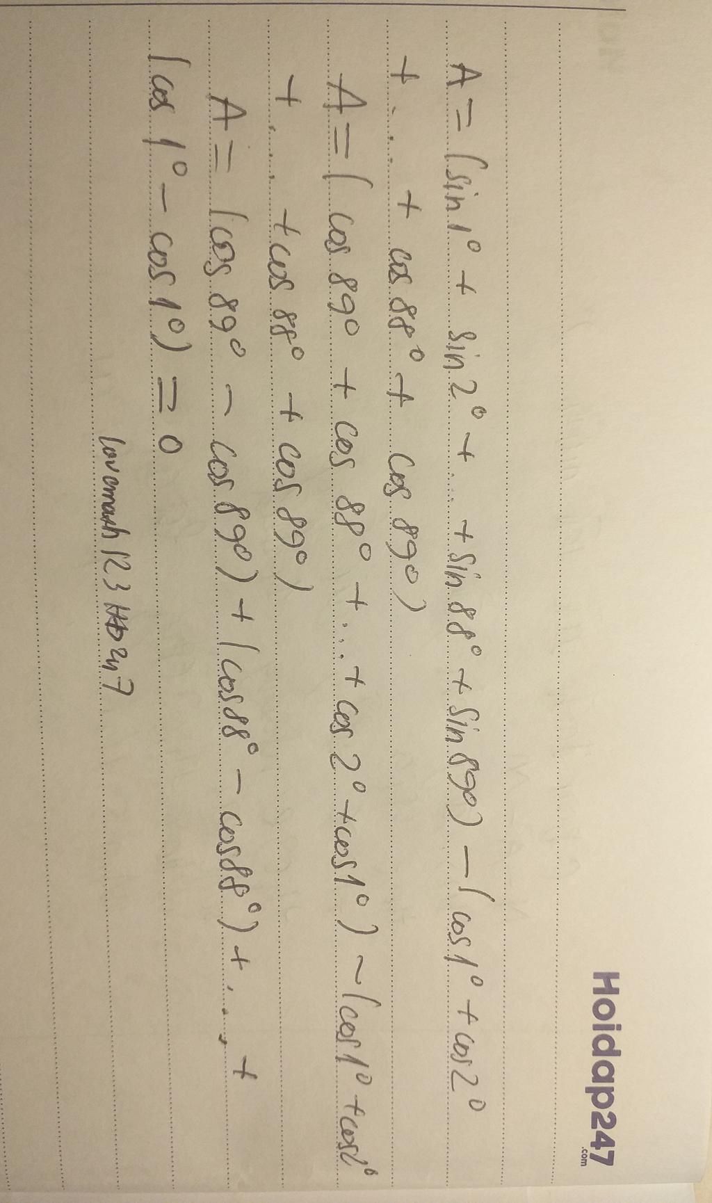 A = (sin 1 + sin 2 + ... + sin 88 + sin89) - (cos 1 + cos 2 +..+cos 88 + cos 89)