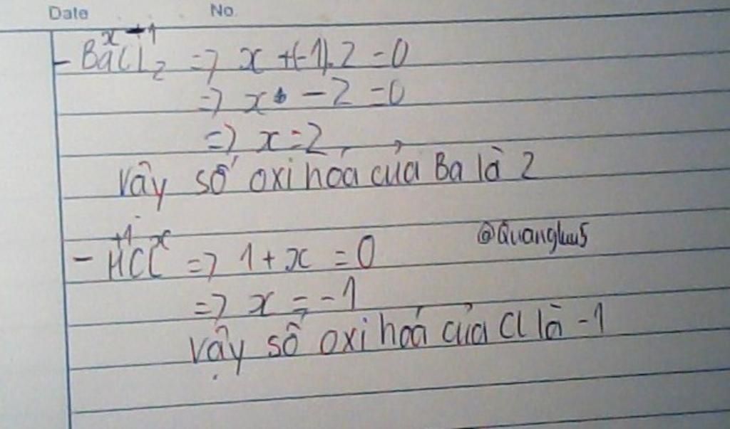 - Trong hợp chất BaCl2 (Clorua bari), nguyên tố Ba có số oxi hóa là +2, và nguyên tố Cl trong hợp chất HCL có số oxi hóa là -1.